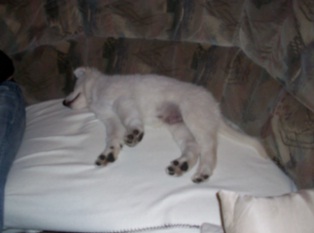 Dann tauchen da Leute am Mittwoch auf, ich kenne sie zwar, sie waren schon einige Male hier um mit mir und den Geschwistern sowie mit der Mama mit Trixi und Sunny zu spielen also auf gut Deutsch „ Gutes Wetter machen „ , nehmen mich auf den Arm, noch schnell zwei Bilder gemacht, Denise und Gaby haben auch nichts verraten sondern mich nur so herzlich gedrückt, ich war der Meinung etwas sehr gut gemacht zu haben Bernd hat mich auch noch gestreichelt, Mama Anouk mich traurig angeschaut und schwups sitze ich in einem mir fremden Auto. Überall Knöpfe, dunkle Scheiben und schon geht die Fahrt, ich auf dem Schoss einer jungen Frau ich glaube es ist die Tochter dieser Leute, los. Ich kam mir vor wie auf der Flucht. Wir entfernten uns von zu Hause ich konnte gar nicht mehr zurückschauen und jetzt wurde mir erst bewusst, hier stimmt etwas nicht. Also jammern , jammern und weiter jammern. Meine Entführer waren der Meinung ich muss mal pullern und damit ja nicht das Auto versaut wird hielten wir an. Das ist die Gelegenheit dachte ich mir. Wenn die Türe aufgeht laufe ich nach Hause. Aber die waren schlauer, ich wurde an eine Leine gehängt. Also nichts mit der Flucht. Vor Verzweiflung habe ich dann gepullert und die Fahrt ging weiter. Mir blieb also nichts weiter übrig als meine Mitfahrer mit Verachtung zu strafen und alles auf mich zukommen zu lassen. Es wird sich schon eine Gelegenheit zur Flucht ergeben. Dann kamen wir in meinem so genannten neuen zu Hause an. Na ja, die Aufnahme war freundlich, da sass noch ein Mann da, weisses Haar hatte er wie ich und versucht mit mir eine Konversation herbei zu führen. „ Hallo Balou, da bist du ja. Gut höflich bin ich zu ihm hingegangen, habe mich streicheln lassen und dann einfach vor seine Füße geschmissen. Ignorieren war die Devise, wenn ich das durchhalte dann bringen sie mich bestimmt zurück. Nun versuchten sie sich bei mir einzuschmeicheln. Zuerst mein so genanntes, zukünftiges Herrchen,