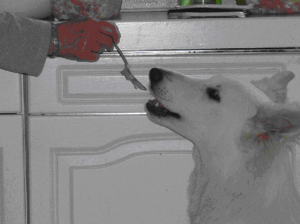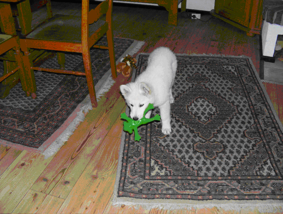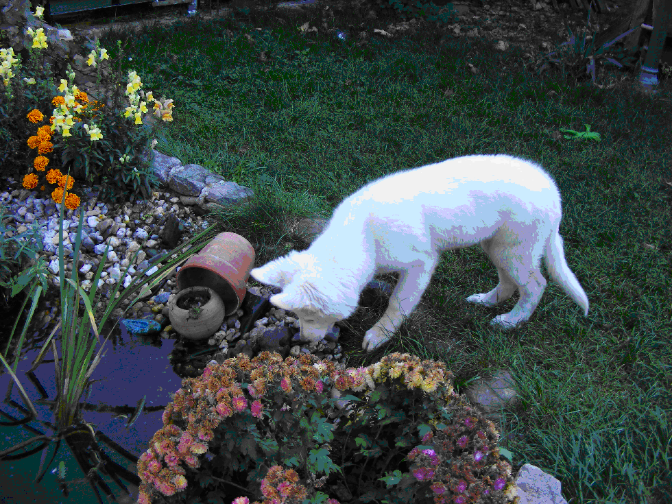 Anstelle an einem richtigen Rind zu knabbern nur ein getrocknetes Ohr. Und dann das, sogar das Futter bekommt man vorgegeben. Man kann sich nichts selber nehmen. Bitteschön, was hat das mit der gross angekündigten Freiheit zu tun. Es gibt noch nicht mal eine Speisekarte. Frauchen und Herrchen bestimmen immer alles. Aber gut, essen muss man ja und manchmal schmeckt es auch nur immer etwas wenig. Ich schmeisse dann einfach die leere Schüssel durch die Küche ( das macht richtig Krach ) dann wissen die schon Bescheid. Aber mehr gibt es dann trotzdem nicht. Nur manchmal Herrchen, wenn er es nicht aushält, das mit dem Krach und mit meinem leidenden Ausdruck, dann gibt er mir ein bis zwei Hähnchensticks, ganz heimlich, die hat er in der Verwaltung, natürlich nur zur Bestechung, aber die sind so lecker. Seht ihr, wenn ich dann noch Hunger habe versuche ich einen Fisch zu fangen, gelingt mir aber nicht die sind zu schnell oder haben schlechte Erfahrung mit einem Eisbären gemacht. Voller Wut rasier ich dann mal eben ein paar Pflanzen oder hole die aus den Töpfen heraus. Das gibt zwar Ärger aber das ist schön, Dann macht das Leben wieder richtig Spass, wenn Herrchen sagt Teufelsbraten und Frauchen, ach lass ihn doch ist doch nicht so schlimm und schwupps habe ich so ganz von hinten rum was leckeres. Also auf zur nächsten Pflanze. Letztens bin ich dann auch mal ganz in den Teich gefallen. Habe es keinem gesagt. Aber nachdem der ganze Teppich nass war haben sie es doch gemerkt. Da war die Freude gross das ich noch lebe.